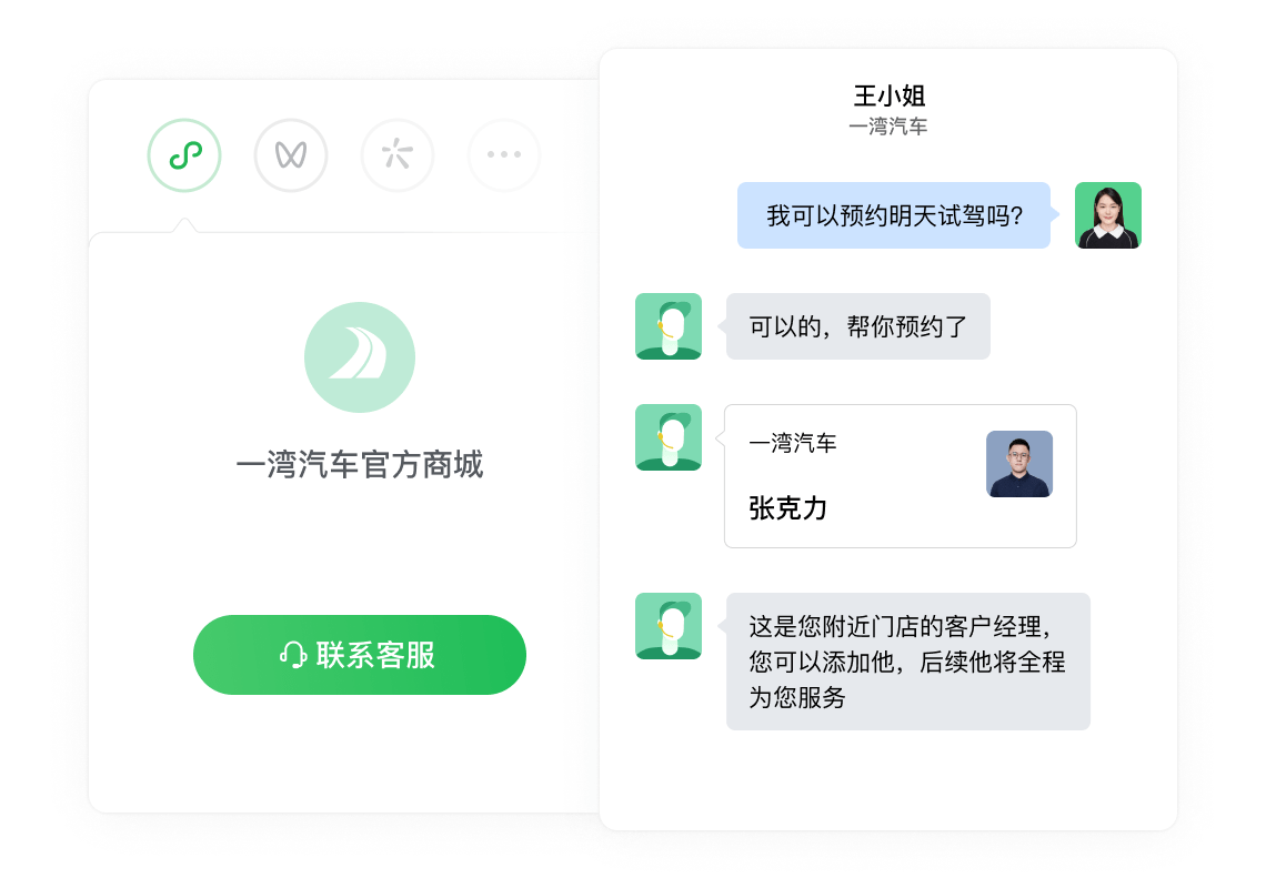 可在微信内、外各个场景接入微信客服,提供一致的咨询体验,还能邀请微信用户添加企业微信,升级为专属服务。