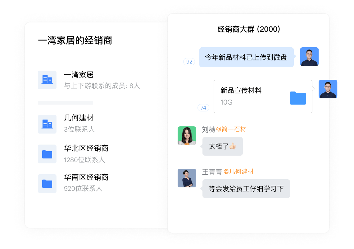 在上下游,你可以统一管理供应商、经销商等业务伙伴的联系人,快速找人沟通;使用文档、会议、日程、微盘等工具高效协作,跨企业共享应用打通业务流程。