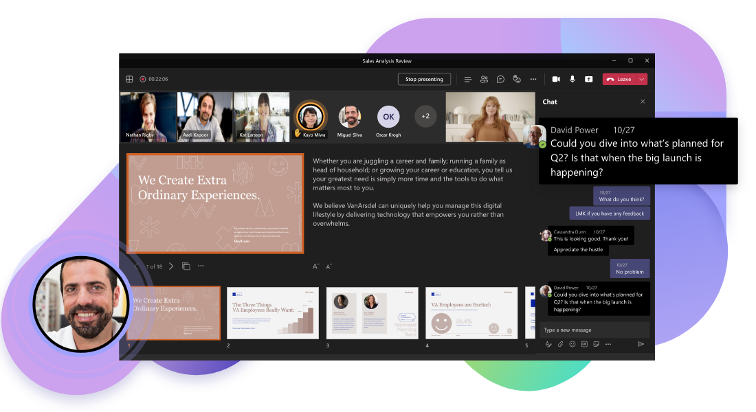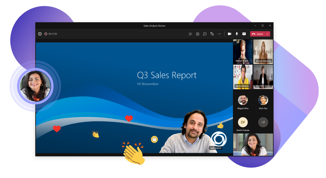 通过 Teams 中的视频会议,将身处各地的人们以面对面的在线方式召集在一起协同工作。