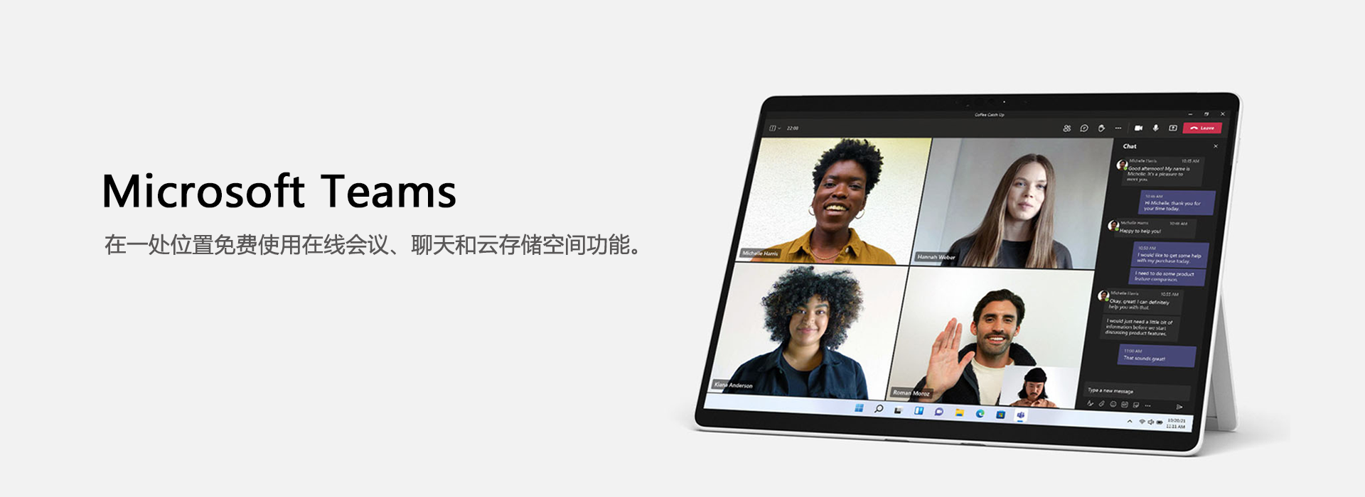 在 Teams 中举行一对一会议或大型虚拟活动。随时随地与几乎任何规模的群组沟通并协作处理项目。