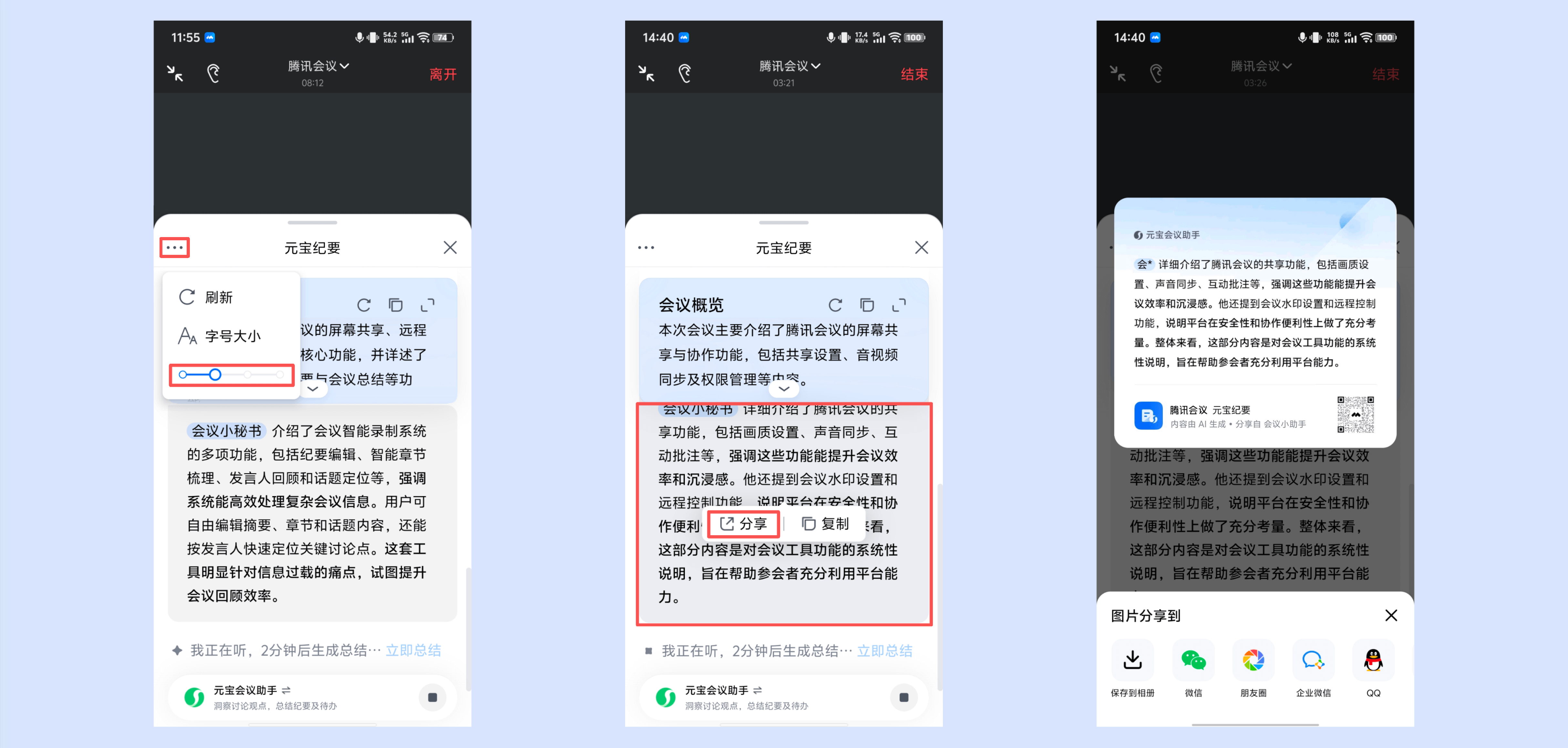 ④3.40及以上版本支持调节字号大小,可点击「元宝纪要」右上角【···】,选择字号大小档位即可。