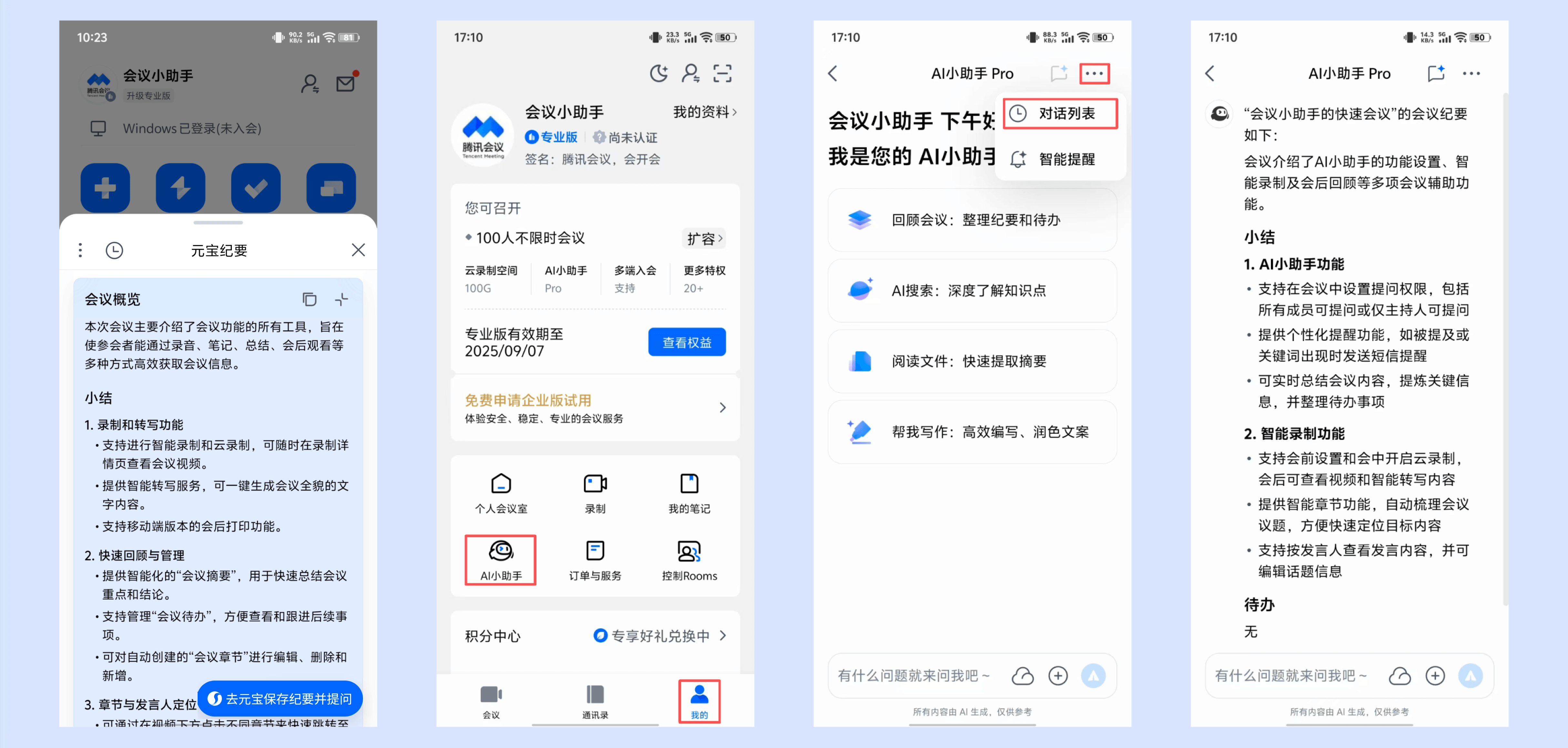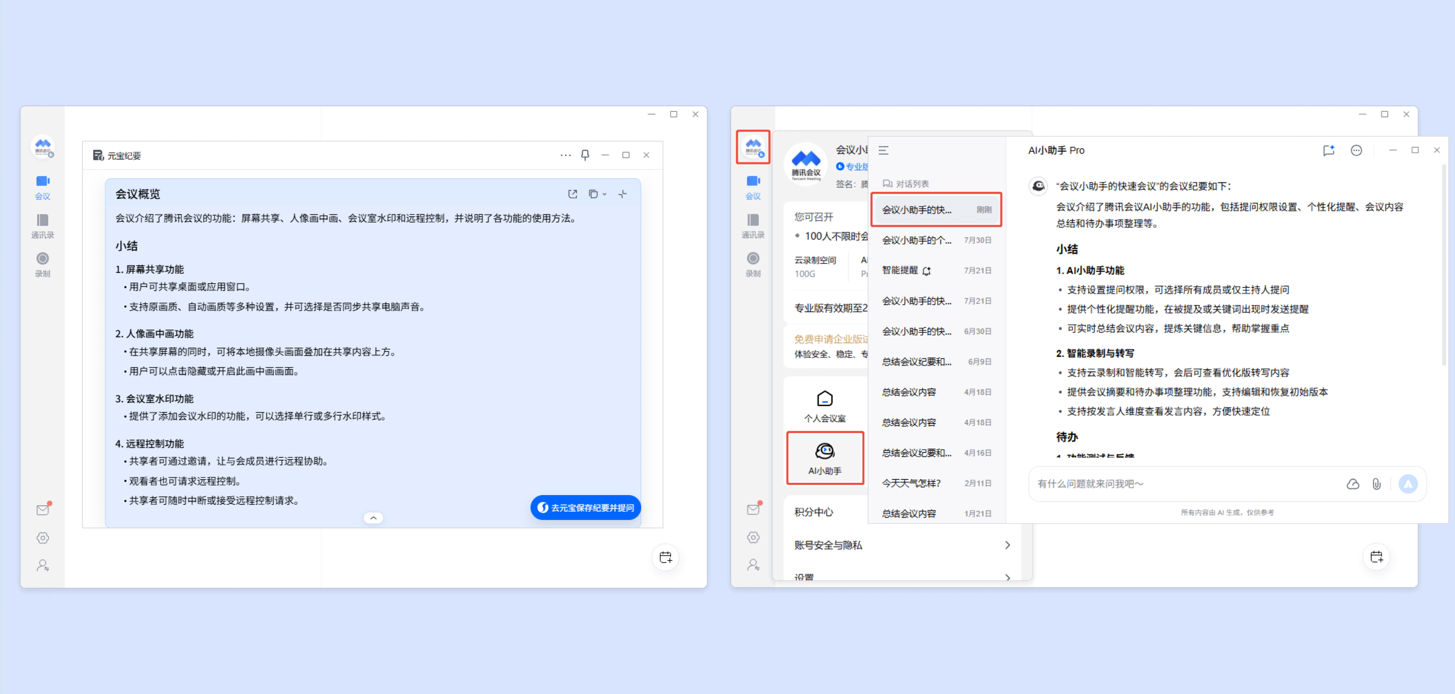 ⑦当会议结束时,会将会中的「元宝纪要」应用保留到会后,便于您快捷查看和使用。并且可以点击右下角的【去元宝提问】,唤起元宝客户端,进行提问?;箍梢栽凇父鋈俗柿弦?AI小助手-对话列表」中找到对应的会议,查看会议概览的内容。