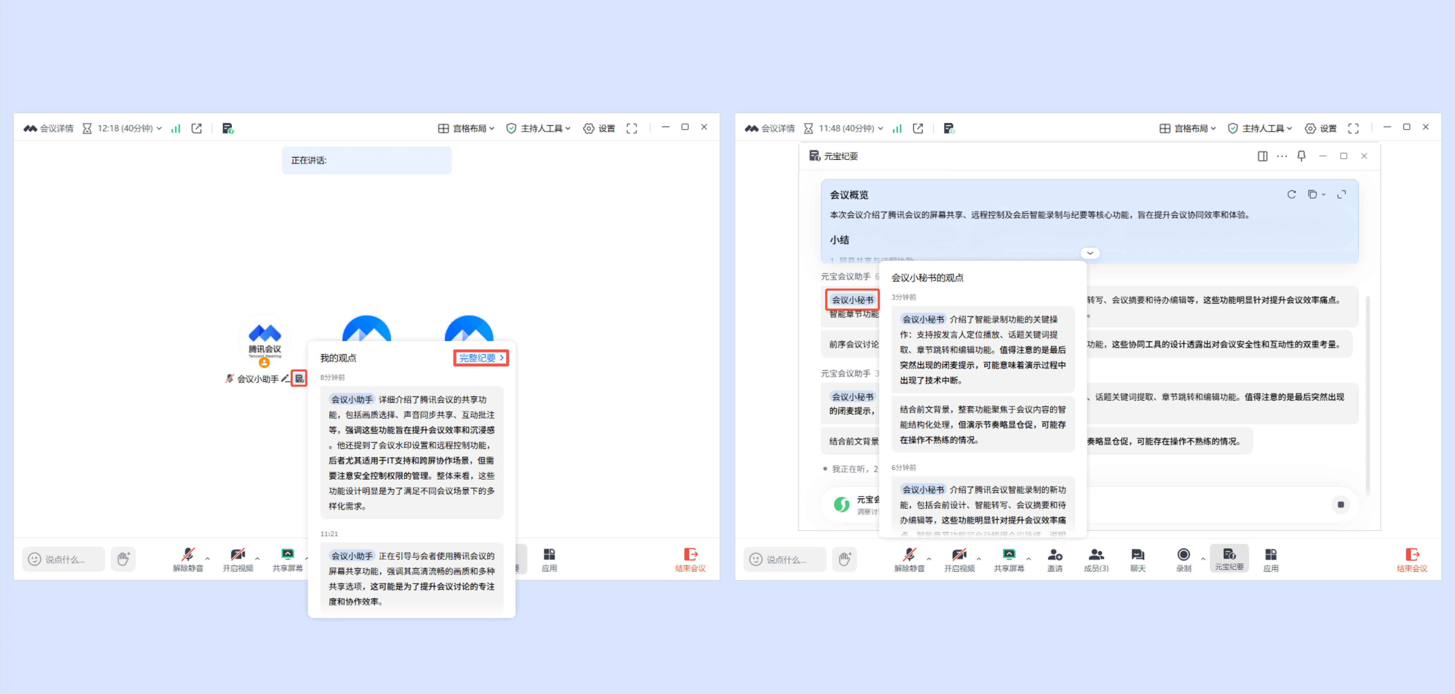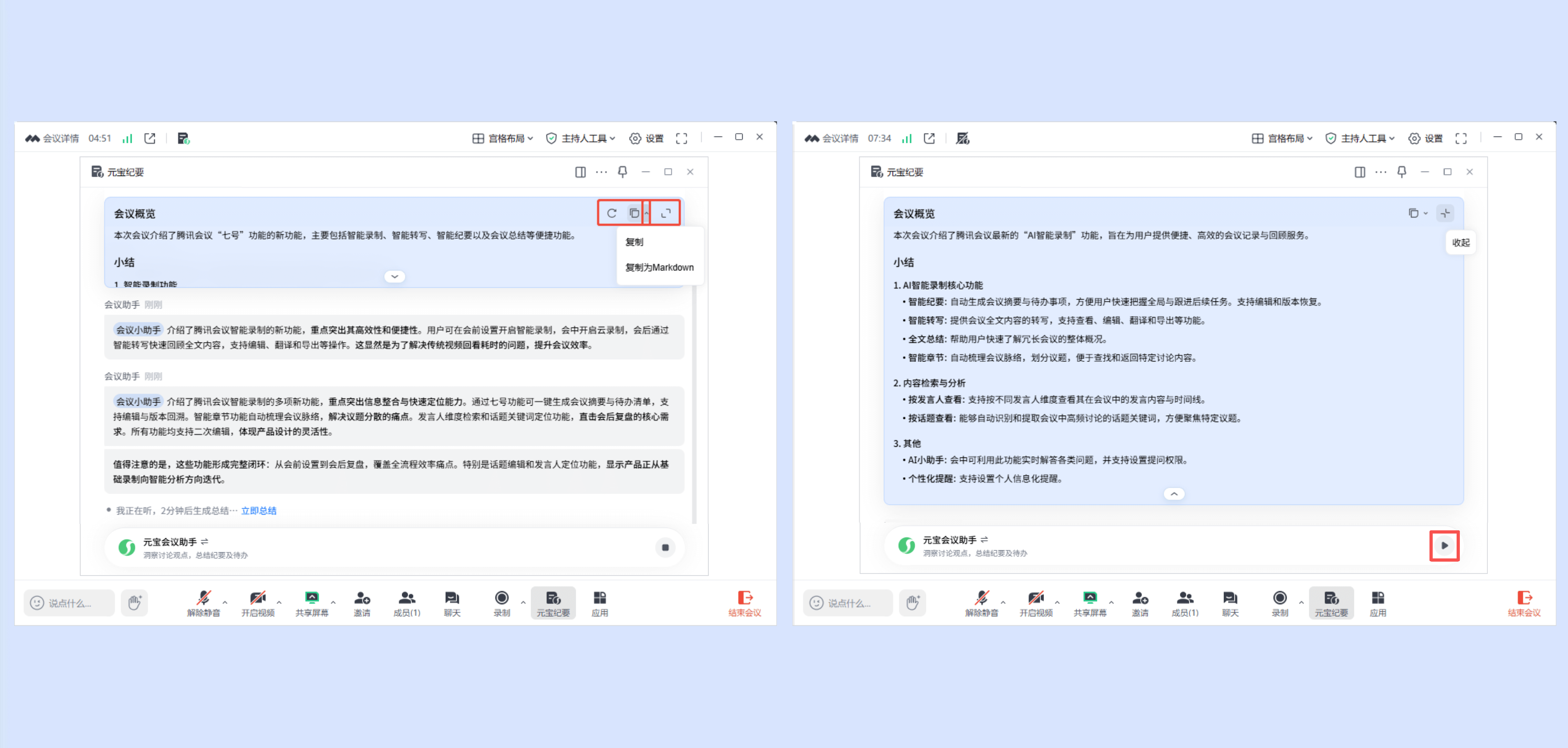 ①会中点击底部工具栏【元宝纪要】,即可唤起元宝纪要侧边栏总结会中内容(仅自己可见),还可以点击顶部状态栏「元宝纪要」图标唤起。