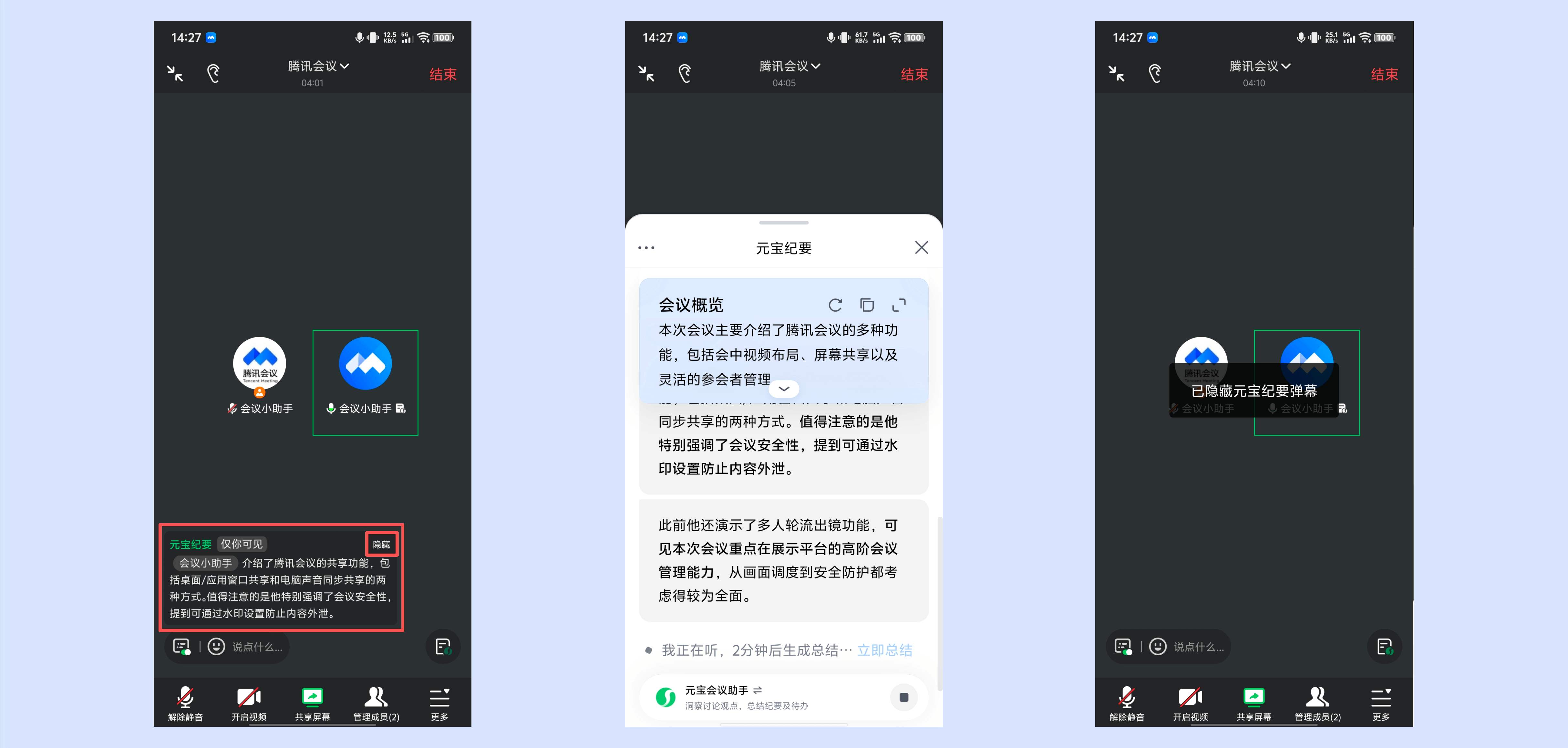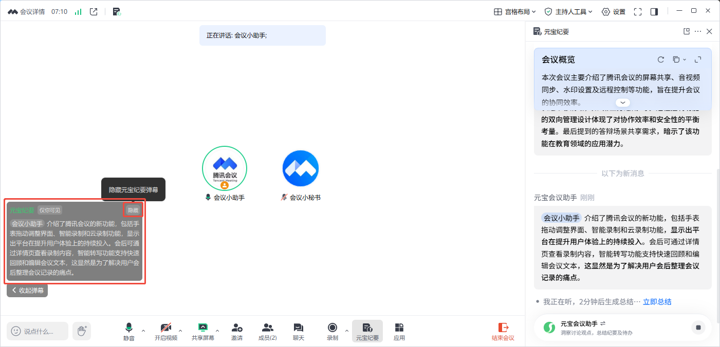 ⑤3.41及以上版本支持纪要内容实时显示在弹幕区,点击元宝纪要弹幕即可唤起「元宝纪要」侧边栏,并定位到最新一条纪要内容。点击【隐藏】即可关闭元宝纪要弹幕,不在弹幕区展示,后续可在【设置】中开启。
