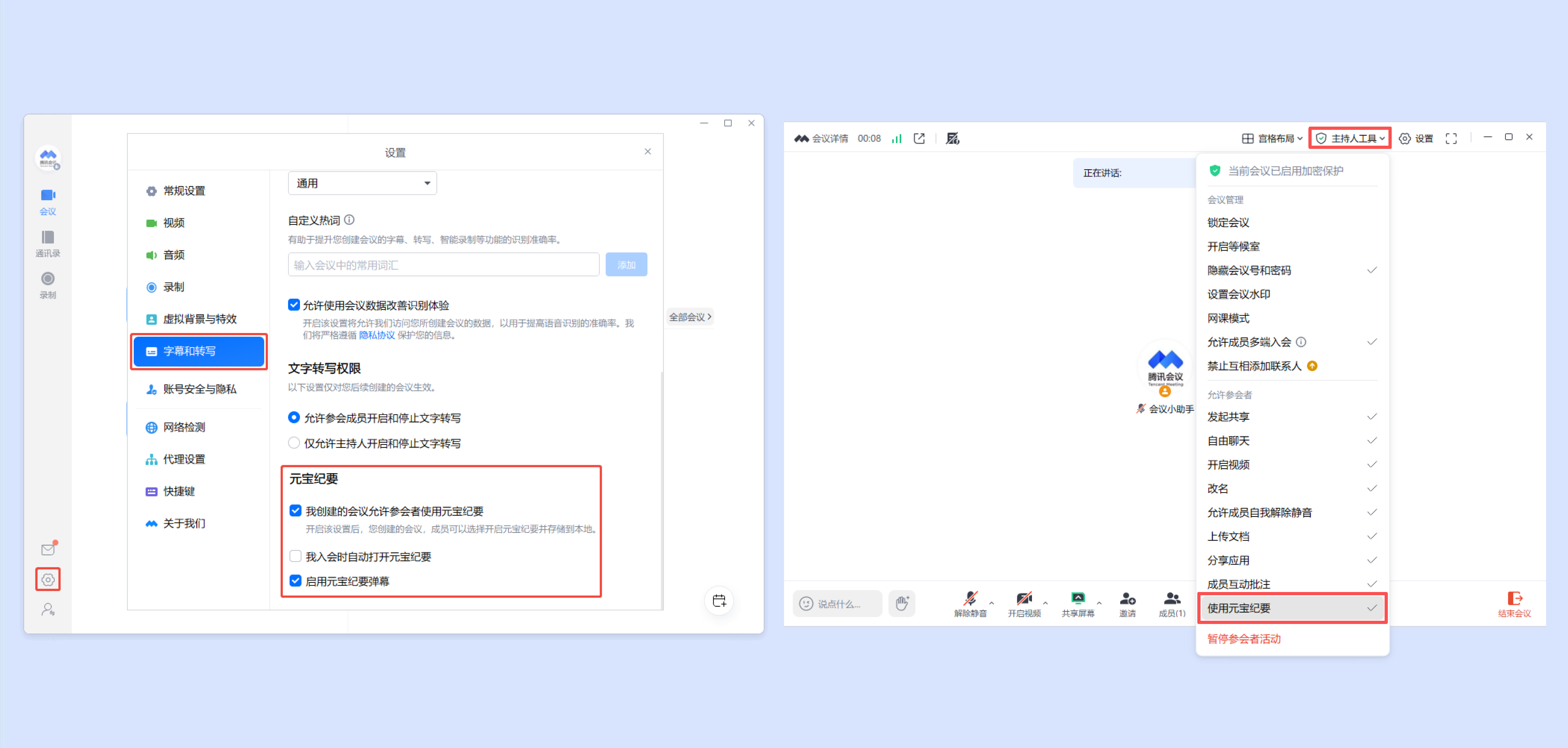 ①会前可点击客户端主界面左下角【设置】->【字幕和转写】,在「元宝纪要」中设置【允许我发起的会议使用元宝纪要】。