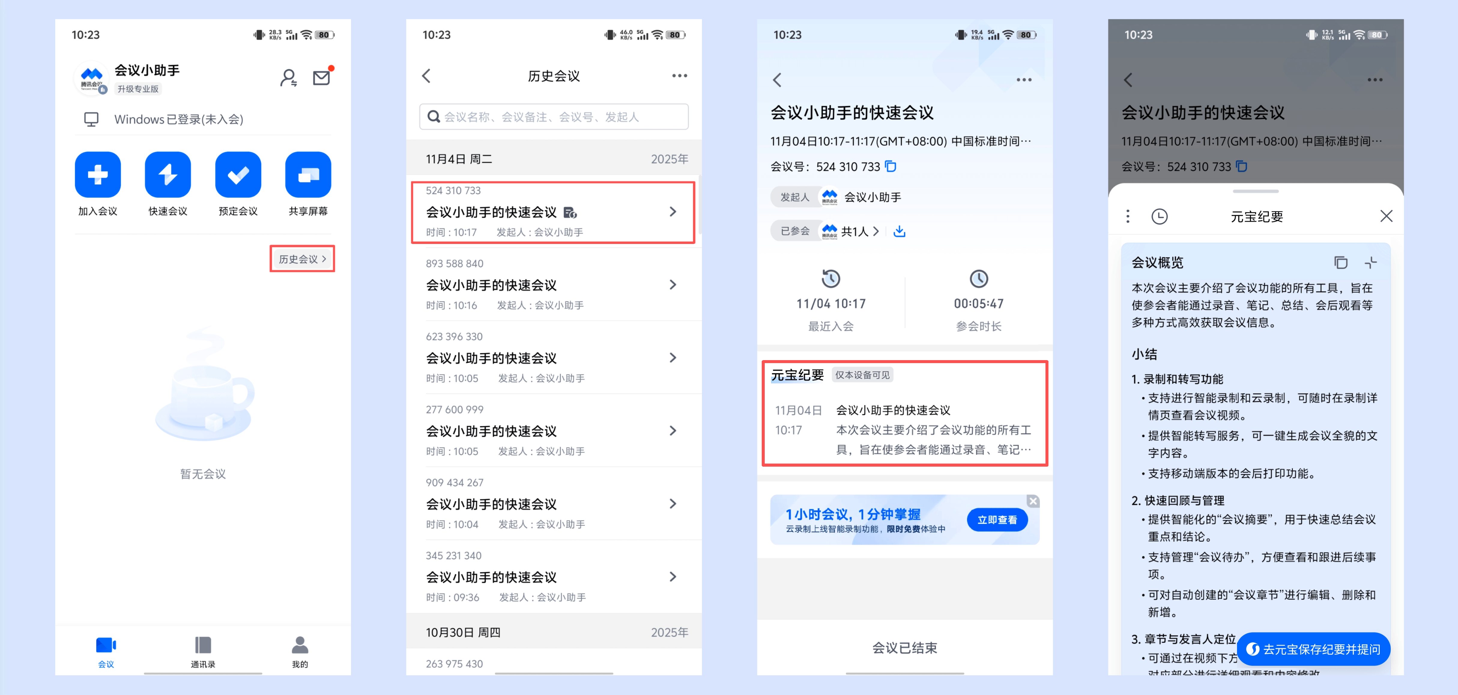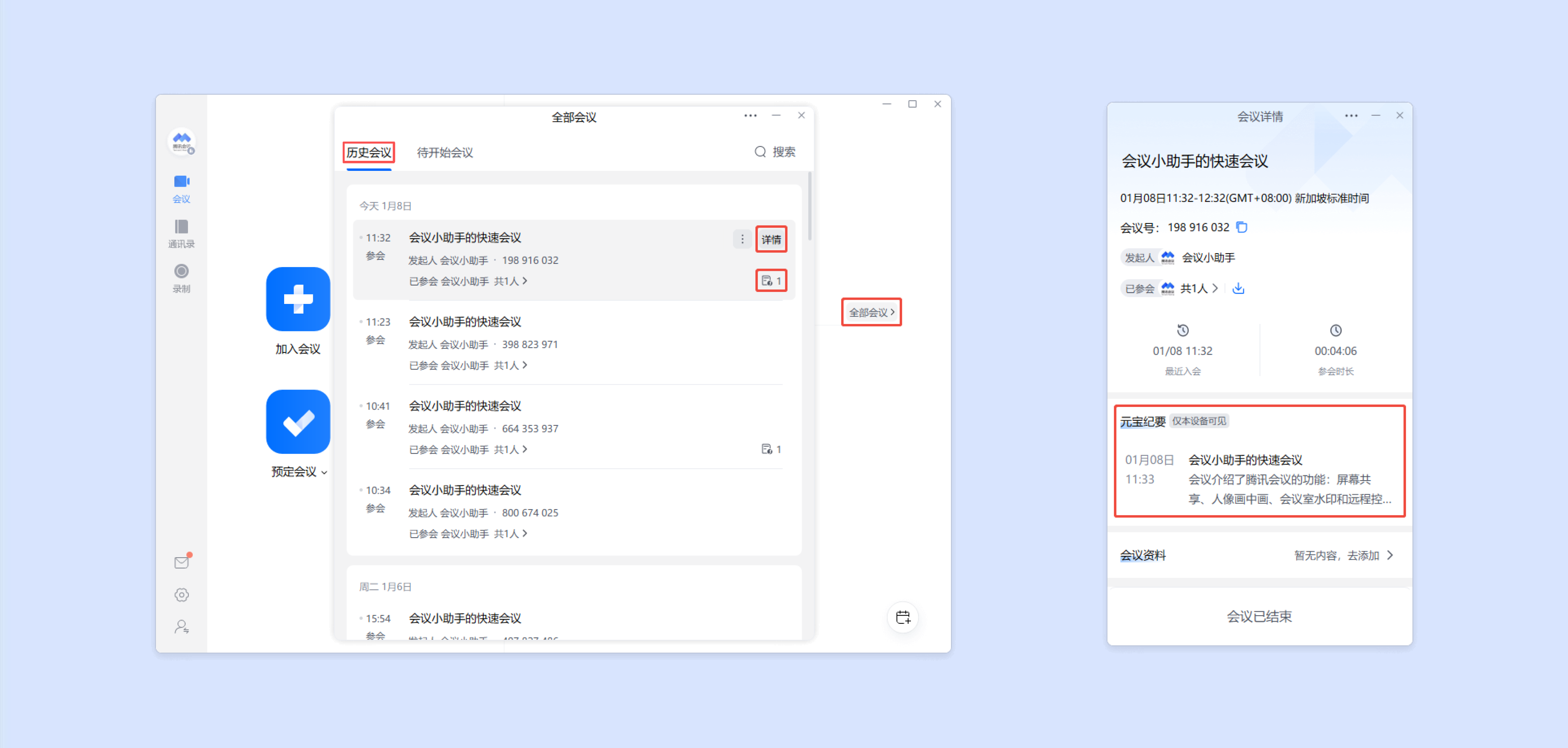 3.38及以上版本可在参会设备的【全部会议】->【历史会议】中找到对应会议,在其详情页面中查看元宝纪要内容。