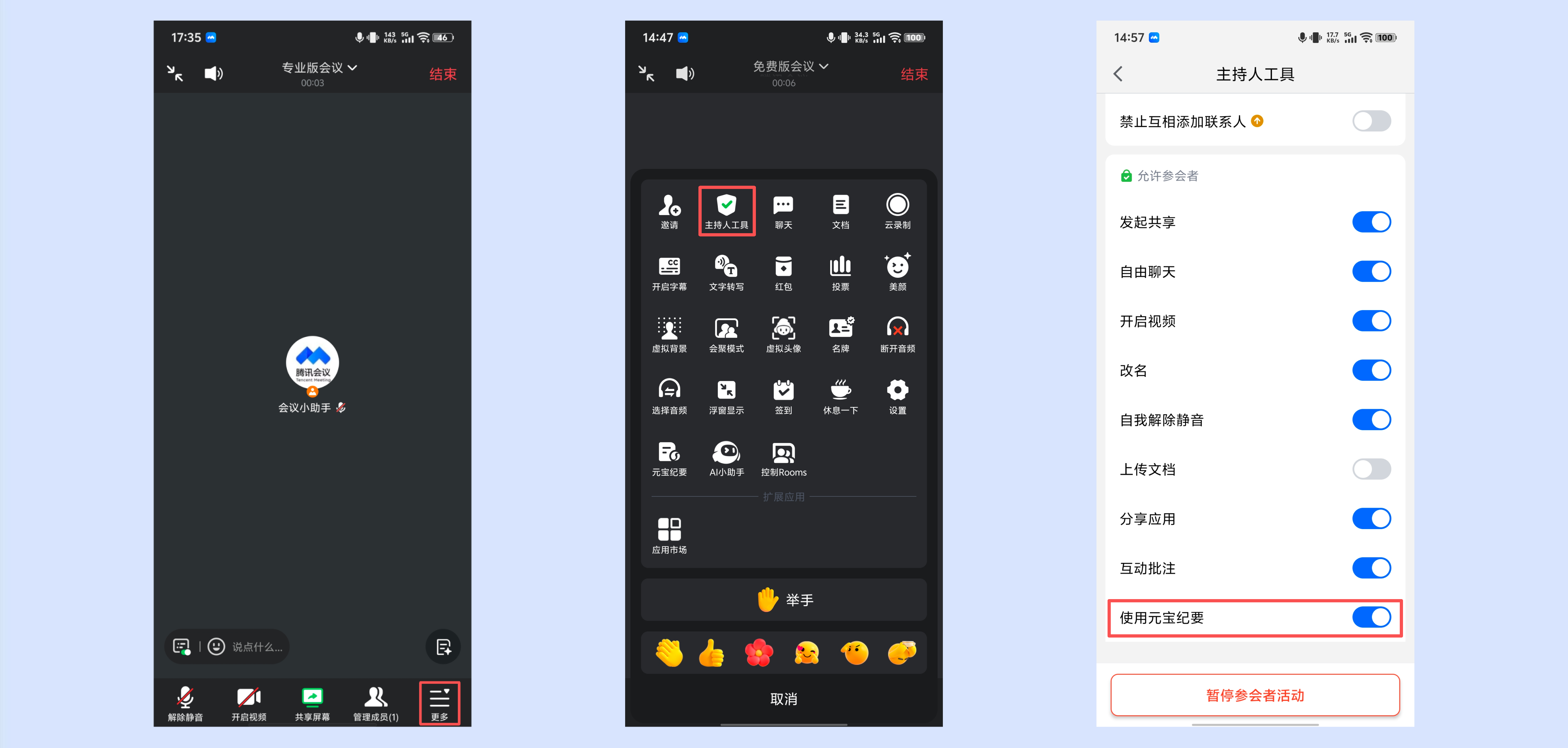 ②会中主持人、联席主持人可在【主持人工具】中,管控是否允许本场会议的参会者使用元宝纪要功能。