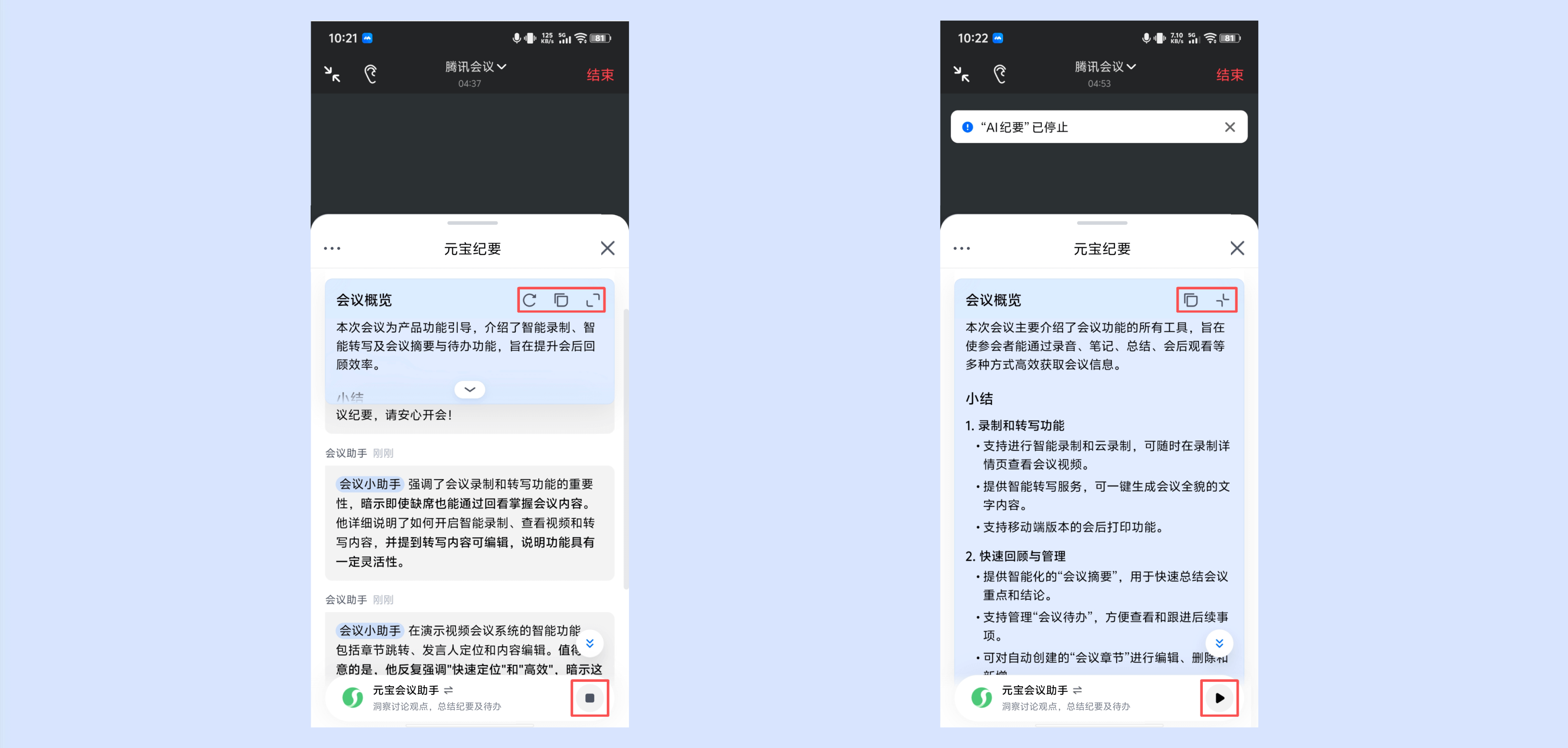 ②点击“暂?!卑磁?,将停止对会议内容进行总结;点击“继续”按钮,即可恢复对后续会议内容的总结。