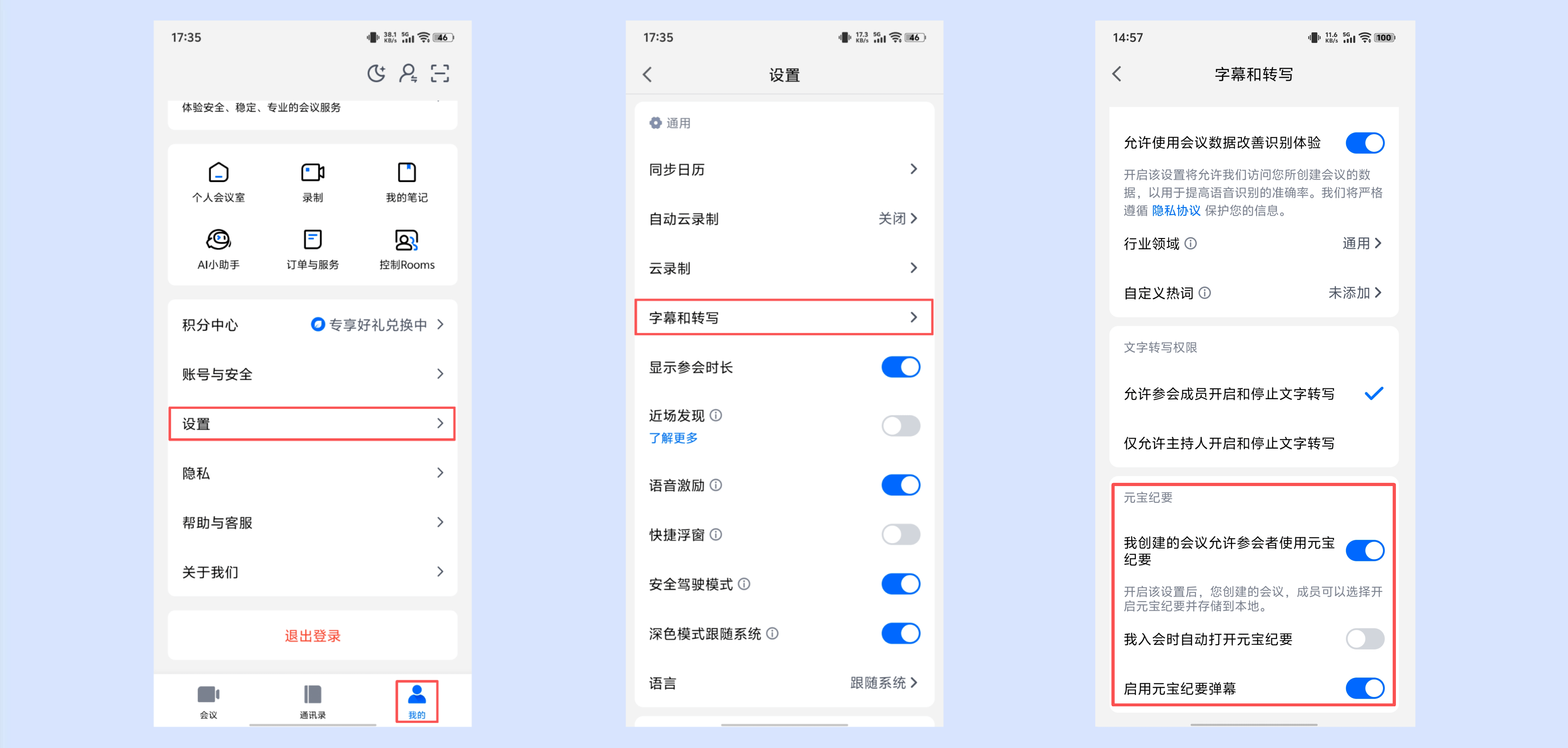 ①会前可点击APP主界面底部【我的】->【设置】->【字幕和转写】,在「元宝纪要」中设置【允许我发起的会议使用元宝纪要】。