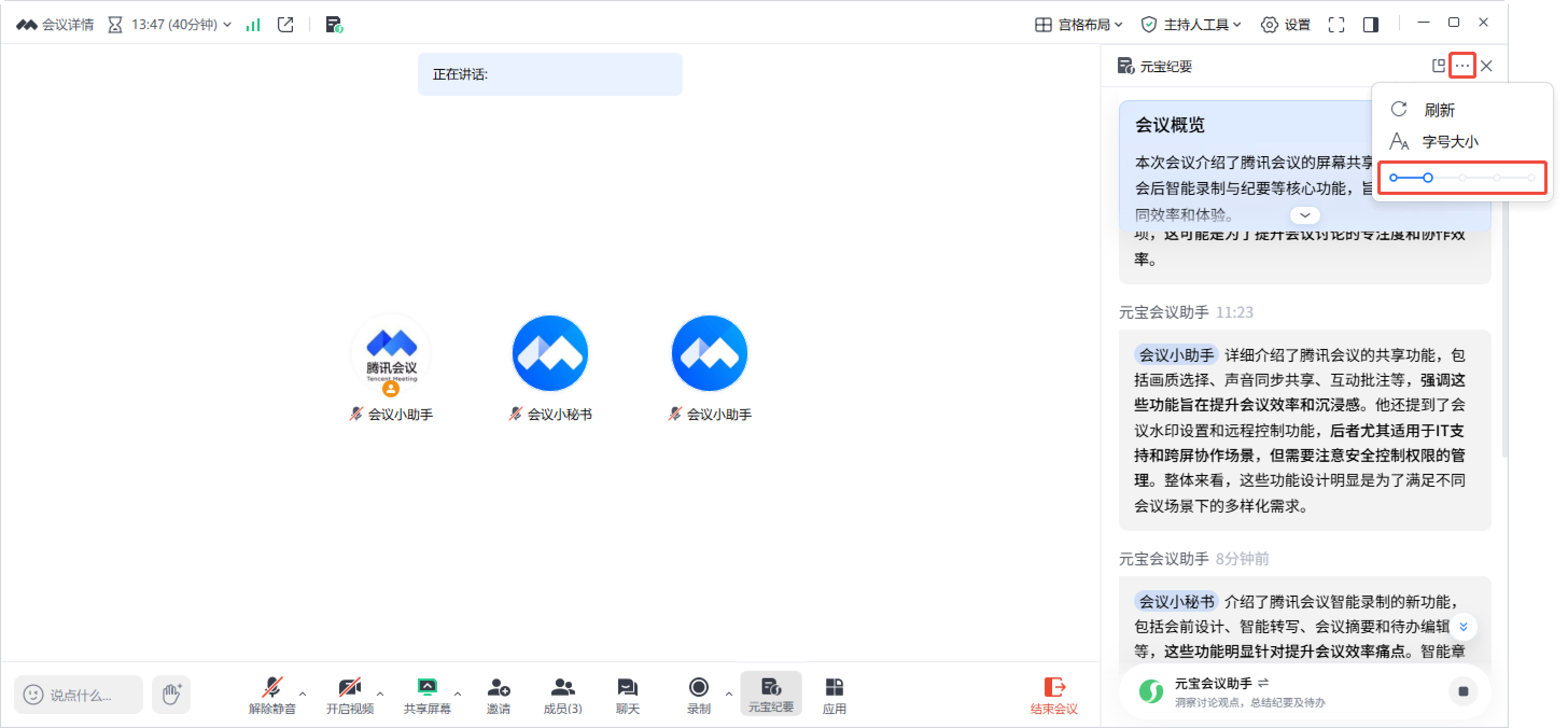 ④3.40及以上版本支持调节字号大小,可点击「元宝纪要」左上角【···】,选择字号大小档位即可。